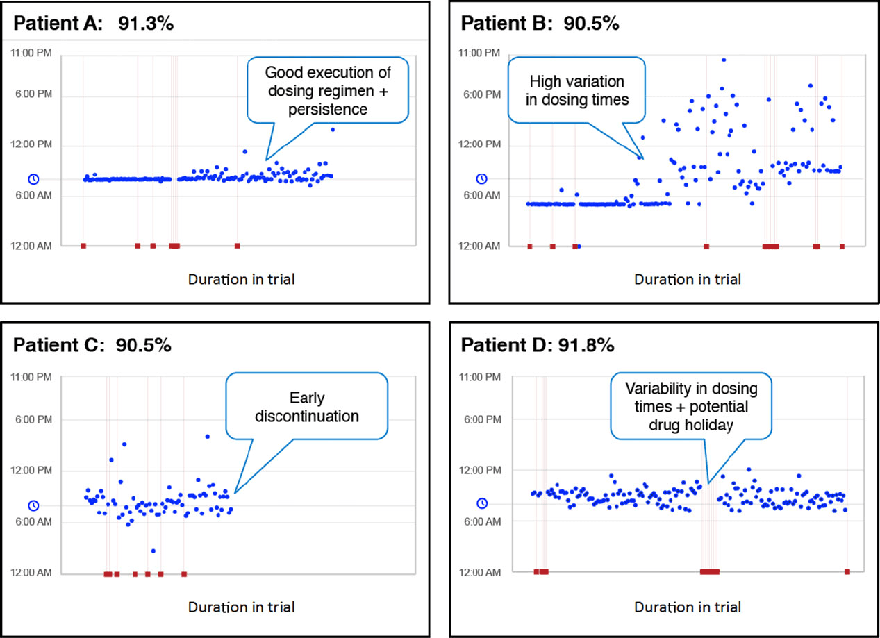 In this case, it was calculated using AiCure’s smartphone-based adherence application. Despite the impressive adherence rates, AiCure data revealed only Patient A was fully “on protocol.”
